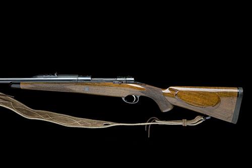 24in. nitro barrel (London proof 2010) with border engraved ramp-mounted bead fore-sight, matt sight rib with open sights and three folding leaf sights, receiver tapped for telescopic sight mount bases, solid side-wall engraved 'AFRIKA' and with some bold acanthus scrollwork, the bolt handle with floral designs, recoil blocks, hinged straddle floorplate with push button release and engraved with scrollwork and a central depiction of a cape buffalo and inscribed 'DE LUXE', pistolgrip stock with cheekpiece, engraved blued steel pistolgrip-cap, sling swivels and leather sling, 14 3/8in. pull including 7/8in. rubber recoil pad, weight 9lb. 7oz.