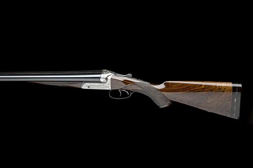 30in. nitro reproved barrels, raised tapered file cut rib with bead fore-sight and intermediate bead-sight, tubes engraved 'HARRISON & HUSSEY LTD. 7. BURY STREET. ST. JAMES'S. LONDON.', 3in. chambers, bored approx. 1/4 and 3/4 choke, treble-grip action with side-clips, automatic safety with white metal inlaid 'SAFE' detail, fine border and acanthus scroll engraving, the makers name in scrolling banners, brushed bright and reblued finish overall, 14 1/2in. well-figured pistolgrip stock (minor crack at hand) with horn pistolgrip-cap and 1in. horn extension, weight 7lb. 9oz.