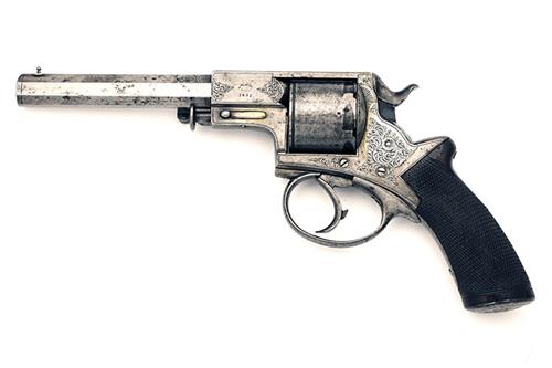 circa 1865, with 6 3/8in. octagonal barrel engraved with a band at the muzzle and scrolls at the throat, dove-tailed bead fore-sight, long sighting groove to the top-strap and initial part of the barrel, partial replacement compound linkage rammer-ejector rod combined mounted to the right hand side, plain cylinder with rope-carved border to the leading edge and raised stops, borderline and scroll engraved solid frame marked 'TRANTER'S PATENT', one-piece chequered walnut grip with engraved domed iron heel-plate and guarded trigger, slight traces of finish in sheltered areas