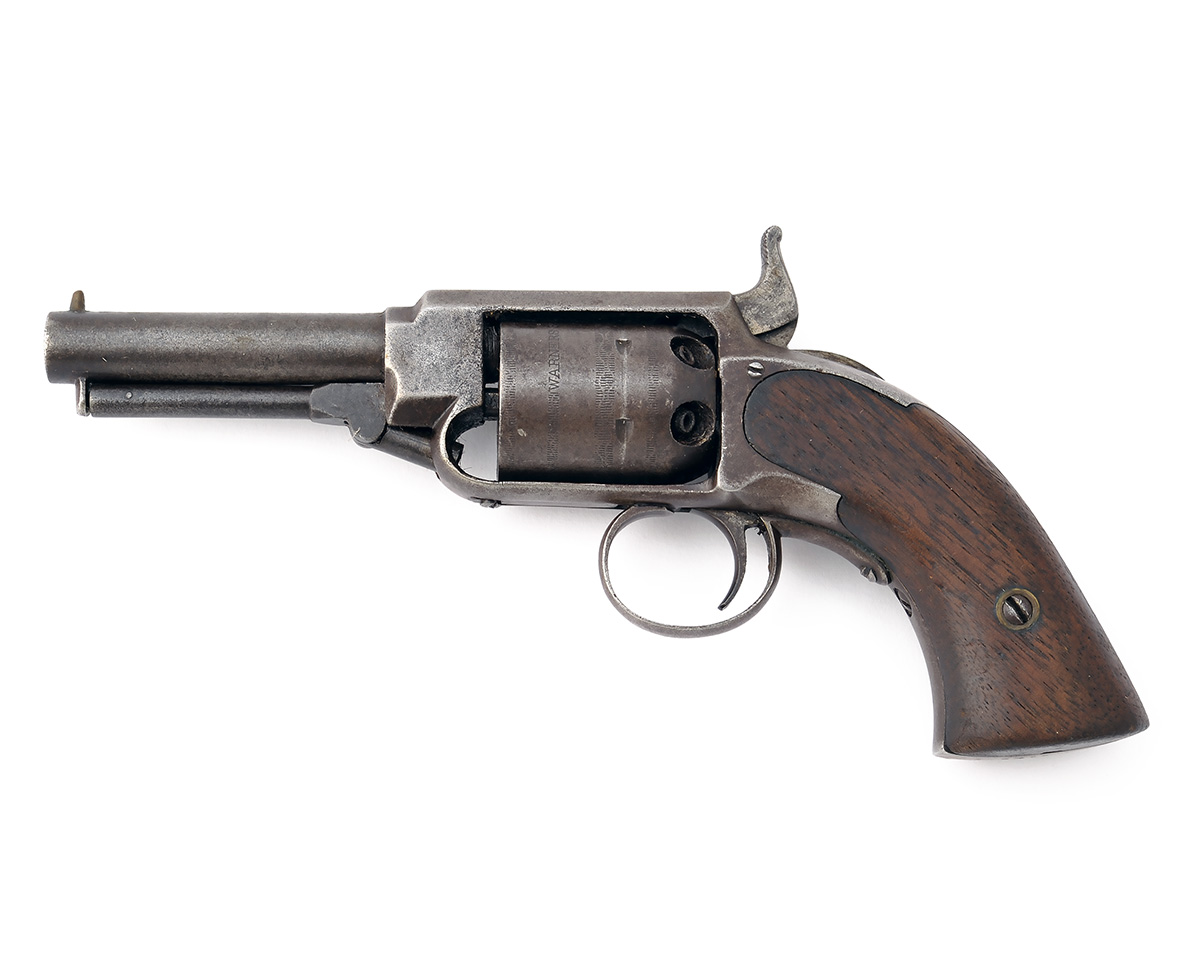 circa 1858, with round 3 1/8in. barrel, pillar fore-sight, the bevel edged top-strap signed 'JAMES WARNER SPRINGFIELD MASS. USA', solid iron frame with central hammer and guarded trigger, plain cylinder with roll engraved bands and marked 'WARNER'S PATENT 1857', smooth walnut grips and hinged under-barrel rammer