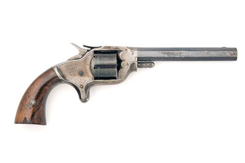 circa 1870, possibly American or Belgian, with blued octagonal Birmingham proved 6in. barrel, shallow white metal crescent fore-sight, moulded and shaped colour hardened solid frame with borderline engraving, cylinder arbor release spring fixed to front left of top-strap, early Smith & Wesson style top-strap cylinder lock, plain blued cylinder, central hammer, spur trigger, smooth walnut flat-based grips with provision for lanyard loop at heel (missing), the whole with strong amounts of original finish