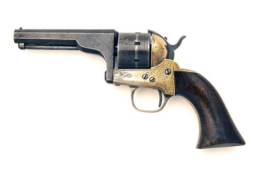 made between 1861 - 63, with blued 4in. octagonal barrel signed on the top-flat 'D. MOORE PATENT SEPT 18. 1860', bead fore-sight, rear-sight notch to the hammer nose, plain blued cylinder marked 'PATENTED APRIL 3.1855 & SEPT 18. 1860, brass border and scroll engraved frame with traces of silver plating, the rear of recoil shield with catch allowing the sideways tilting of the barrel and cylinder for loading, smooth walnut grip and guarded trigger, under-barrel ejector rod