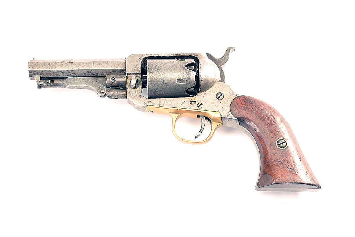 A .31 PERCUSSION REVOLVER UNSIGNED MODEL 'WHITNEY POCKET SECOND MODEL, THIRD TYPE', serial no. 19725 for early 1860s with 3 1/2in. octagonal barrel marked 'N. HAVEN', plain 5-shot roll-engraved cylinder (faint), closed iron frame and grip-traps, brass trigger-guard, walnut grips with piece missing from front left toe, cleaned of finish