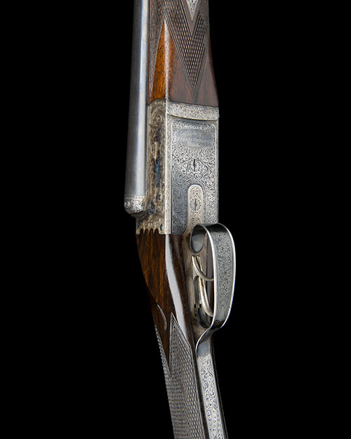 27in. nitro barrels with matt Churchill-rib, the tubes engraved 'CHURCHILL (GUNMAKER'S) LTD. 61 PALL MALL. ST. JAMES'S. LONDON. ENGLAND.', and with acanthus scroll detailing at the breech ends, 2 3/4in. chambers, bored approx. true cyl. and 1/4 choke, scroll-back action with slender standing breech, automatic safety with gold-inlaid 'SAFE' detail, double rolled-edge triggerguard, fully engraved with acanthus scrollwork, the underside engraved with the model designation in an oval, retaining some original colour-hardening and finish, 14 5/8in. well-figured stock, cast on for the left shoulder, weight 6lb. 10oz., in its lightweight canvas and leather case