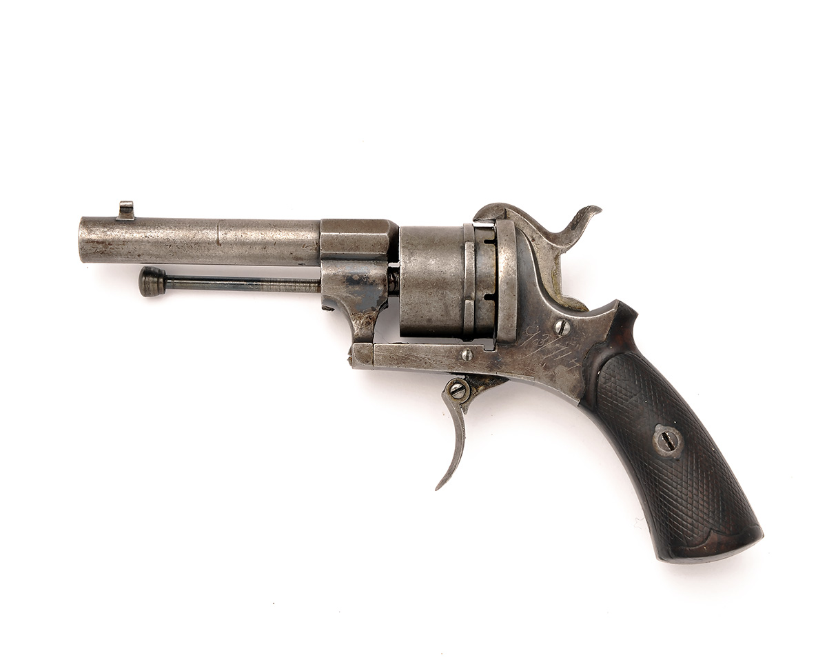 A 7mm PINFIRE POCKET REVOLVER, UNSIGNED, serial no. 308, Spanish circa 1865, with round 3 3/8in. barrel, plain cylinder with raised ratchet locking, open iron frame and chequered walnut grips, trigger return spring weak