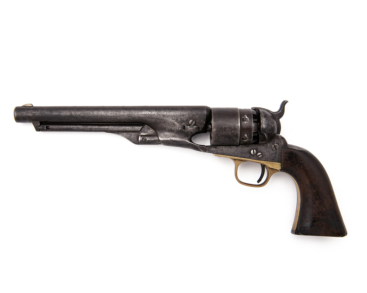 for 1863, with round 8in. barrel signed 'ADDRESS COL. SAML COLT NEW-YORK U.S. AMERICA', stepped cylinder with roll engraved scene, open iron frame marked 'COLTS PATENT', brass trigger-guard and iron back-strap, fitted with a smooth walnut one-piece grip and creeping under-barrel rammer, traces of finish with some bruising