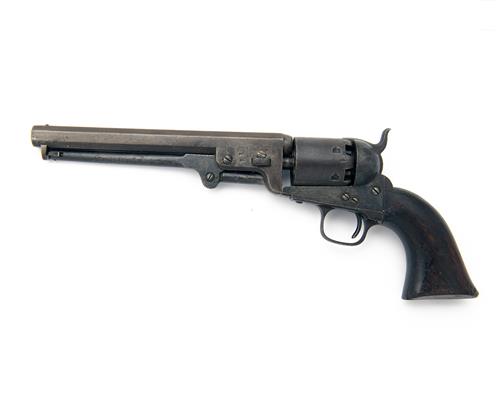 for 1855, with 7 1/2in. octagonal barrel signed 'ADDRESS COL. COLT LONDON', London proofs at breech, plain six-shot cylinder scrubbed of scene, open iron frame marked 'COLT'S PATENT', iron grip-straps and trigger guard, smooth walnut grip with traces of unit markings on the right hand side, possibly '17' over '6' and hinged under-barrel rammer, finish worn and darkly stained