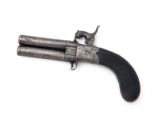 circa 1840, Birmingham proofs, with turn-off 3 1/4in. barrels (frozen), engraved bands and false rifling at muzzle, scroll engraved central hammer boxlock action with radiused corners, integral nipple guard to under-side, folding automatic trigger and finely chequered walnut bag-shaped butt with nickel oval escutcheon to wrist