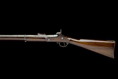 dated for 1862, with rifled 39in. iron barrel, block and blade fore-sight, elevating ladder rear-sight, 'L.A.C.' inspectors stamps and commercial London proofs at breech, plain military type lock signed on the bar 'L.A.Co 1862' and with crown over V.R. device to tail, walnut three-quarter stock with brass furniture, provision for three iron barrel-bands (middle example absent) and iron jag-ended ramrod