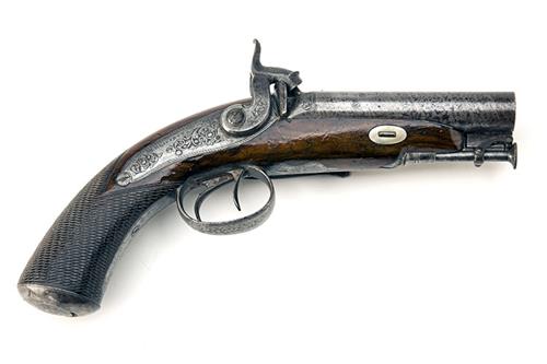 circa 1840, with twist iron 4in. barrels, the top-rib signed 'JOHN BLISSETT, 322 HIGH HOLBORN LONDON', bead fore-sight, standing notch rear-sight, scroll and gold line engraving to breech, borderline and scroll engraved top-tang, border and scroll engraved curved back-action locks signed 'J. Blissett', slab-sided hammers (one repaired or replaced), walnut full-stock with chequered grip, cap-trap to the engraved and domed iron pommel, belt hook (possibly later) mounted to the left lock and captive stirrup under-barrel ramrod, together with a slightly later mahogany case relined and recompartmented for this pistol in green baize and containing a ball mould, powder flask, oil bottle, nipple-key, cap-tin and cleaning rod