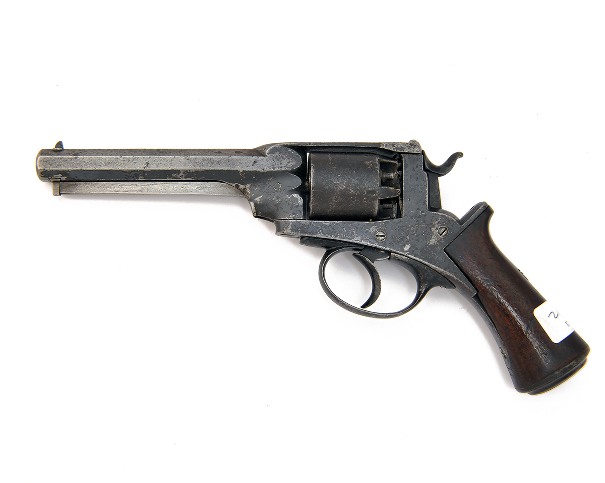 A 54-BORE PERCUSSION REVOLVER SIGNED 'DEANE & SON', MODEL DEANE-HARDING 1858 REVOLVER, serial no. 6366, with 5 3/4in. octagonal barrel, solid frame marked 'DEANE & SON. LONDON BRIDGE' on top flat and 'DEANE-HARDING PATENT No. 6566' to r/h side, five-shot plain cylinder with safety-catch, walnut one-piece grip (shrinkage) with 'H 1/2 N' impressed, butt-cap with scroll engraving, under-barrel rammer, worn with some pitting.