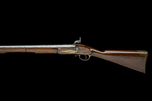 assembled from obsolete musket parts circa 1841, with 33in. barrel, bayonet stud forming the fore-sight, no provision for rear-sight, broad arrow and ordnance stamps at breech, borderline engraved lock of flintlock type signed 'ENFIELD' below a crown over 'V*R', borderline engraved hammer, walnut three-quarter stock, the right hand side of butt stamped 'R.M. ENFIELD' in a circle, brass furniture, Lovells bayonet catch at muzzle and replacement iron ramrod, some heavy cleaning and large inlet repair to underside of fore-end