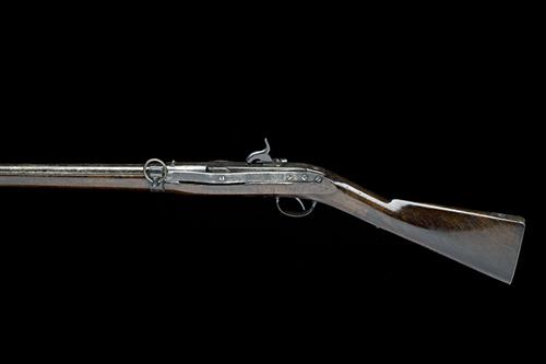 dated for 1845, with round 21in. barrel, small blade fore-sight, standing notch rear-sight, broad iron receiver swelling forwards of centre with a lift-up reverse loading breech operated via a thumb side-lever, offset central hammer, the top of breech-block marked 'U.S., S. NORTH, MIDLTN., CONN 1845', walnut three-quarter stock, iron furniture including two iron barrel-bands (the rear with saddle-ring) and under-barrel ramrod