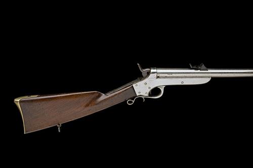 also known as the '11th New York Volunteer Cavalry Model' because of that unit's adoption of this arm, with 19in. nickel-plated barrel sliding forwards on opening, recessed breech, nickel-plated receiver, central hammer, saddle-ring to left hand side, under-lever forming the trigger-guard and walnut butt-stock with brass heel-plate, re-plated in antiquity