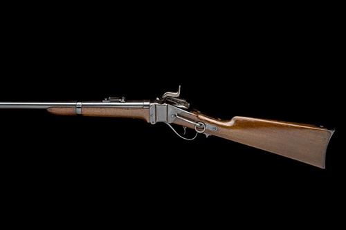 circa 1864, with re-blued 22in. barrel, block and blade fore-sight, folding ladder rear-sight, faint traces of model details at breech, vertical dropping block receiver, the lockplate with in-built pellet primer and marked 'R.S. LAWRENCE PAT. APRIL 12TH 1859', the body of the lock marked 'C. SHARPS PAT. OCT. 5TH 1852', straight hand walnut butt-stock, no provision for patchbox, iron heel-plate, under-lever opening, saddle-ring mounted to left hand side of the receiver, walnut splinter fore-end and single iron barrel-band, refinished throughout