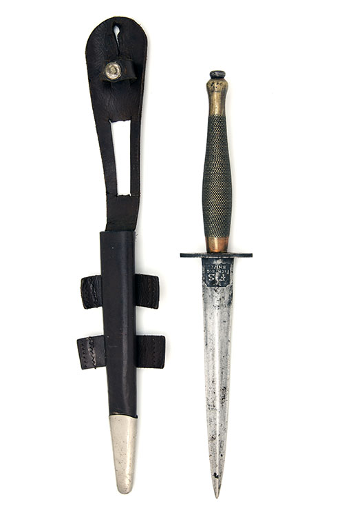 circa 1944, with 6 5/8in. stiletto blade possibly cleaned of black finish, the forte etched on one side with the 'WILKINSON SWORD CO. LTD LONDON' behind crossed sword trade-mark, the reverse etched with the name of the knife, blacked iron boat-shaped cross-guard, finely machine chequered brass hilt with traces of coppering and bun nut pommel, complete with its brown leather sleeve scabbard with twin leather tabs, nickel chape and 'Newey' press-stud retainer (central portion of belt loop absent, top with user-made buttonhole
