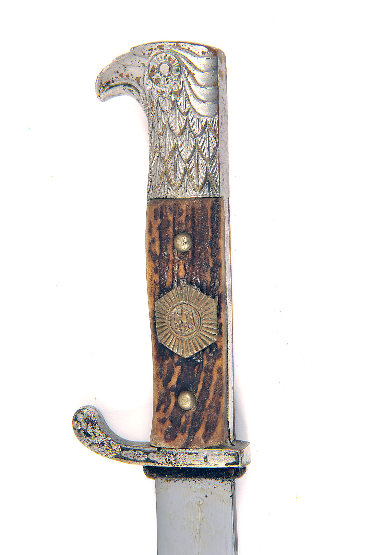 A GERMAN WEIMAR POLICE PARADE BAYONET, UNSIGNED, with 10in. plated blade false edged for the last 3 1/4in, narrow blind fuller to the back edge, plated hilt carved with oakleaves on the single quillion and with a stylised eagle's head to the pommel, no provision for fixing to a rifle, stag-horn grips with applied insignia and complete with leather scabbard (drag replaced)