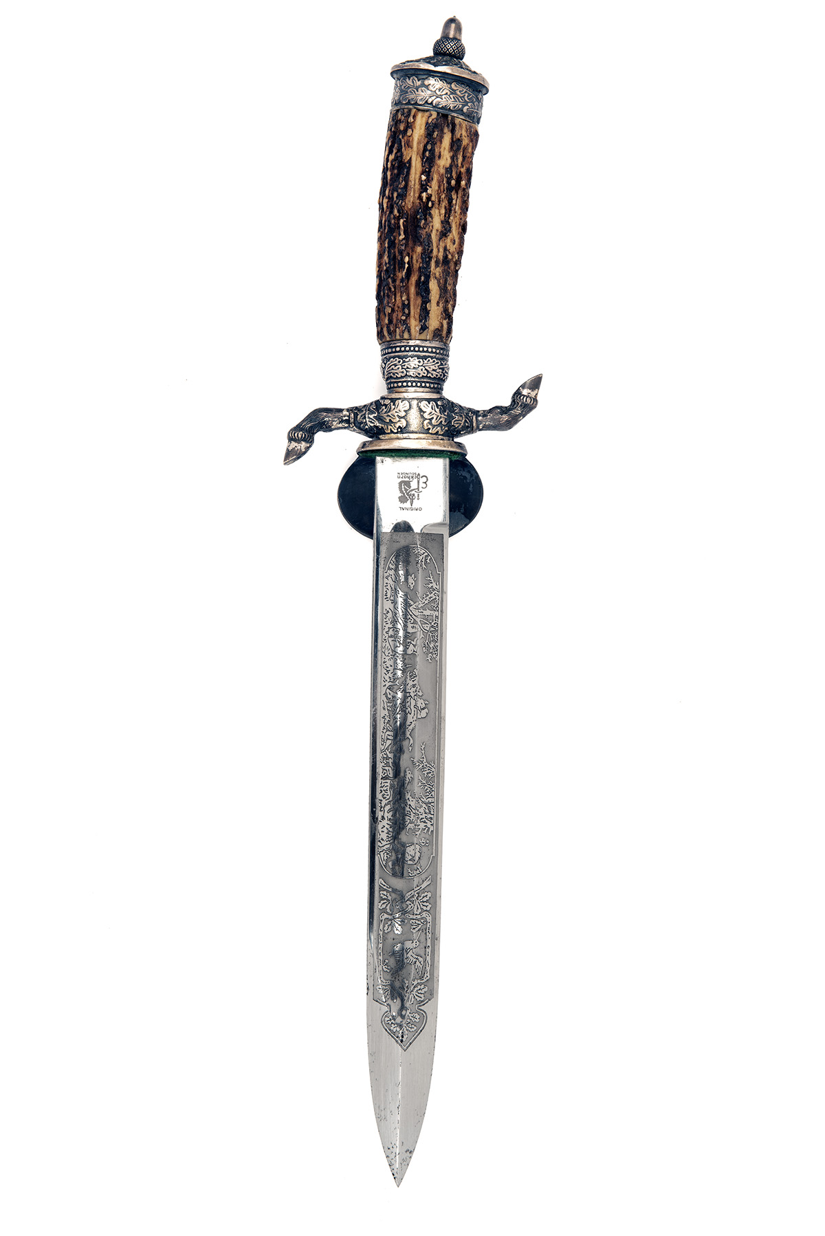 early middle 20th century, with 10in. single-edged spear-point fullered blade etched with hunting scenes and game on each side, silvered hilt with downturned shell guard decorated in relief with a capercaillie in low relief, the cross-guard with vertically recurved quillons terminating in hoof finials, natural staghorn grip with applied Nazi Hunting Association insignia, pommel carved with oakleaves and mounted with acorn finial, complete in original green leather scabbard with plated and engraved mounts