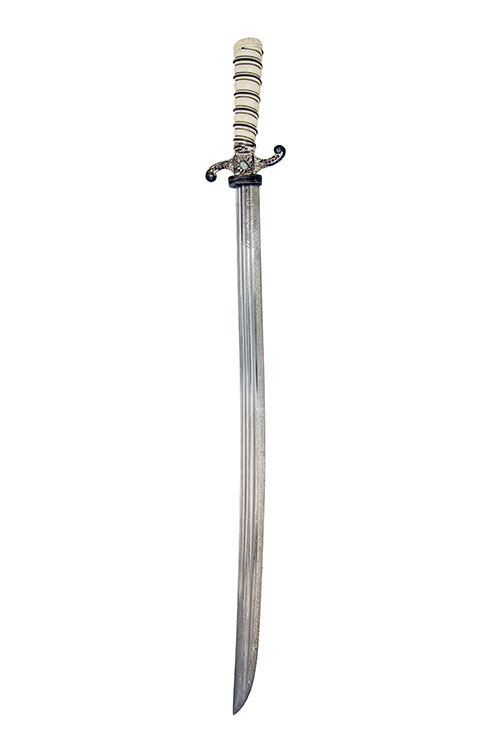 manufactured for the U.S. market in 1981, the slightly curved twin fullered single edged 21in. blade etched along the edge with the name and year of every major battle fought during the American War of Independence 1775-1781, each battle separated by crossed sabers, both sides of the blade with Wilkinsons trademark, plated ribbed mount at the ricasso, carved and moulded silver-gilt cross-guard with turned forwards and back quillions, spirally carved and wire bound ivorine grip with carved pommel, no scabbard, some wear to plating and minor marks to blade