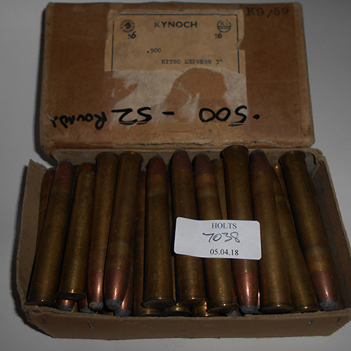 FIFTY TWO .500 3" KYNOCH NITRO EXPRESS CARTRIDGES HIGHLY COLLECTABLE comprising of one original birmingham kynoch carton containing cartridges with soft nose jacketed lead bullets 570grn and loaded with 30 gr No 1 rifle powder