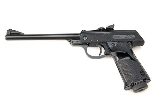 circa 1968, with 9 1/2in. blacked barrel, ramp fore-sight, adjustable rear-sight, black crackle-finished receiver with square-cut back, black chequered plastic grips and trigger-guard acting as the cocking link, the whole appearing little used and complete in a 'WILLIAM POWELL & SON, BIRMINGHAM' black vinyl covered storage case compartmented and lined in red baize, trade label inside lid and appearing contemporary with the pistol the case also containing the cocking aid, sighting elements, cleaning rod and other sundry accessories
