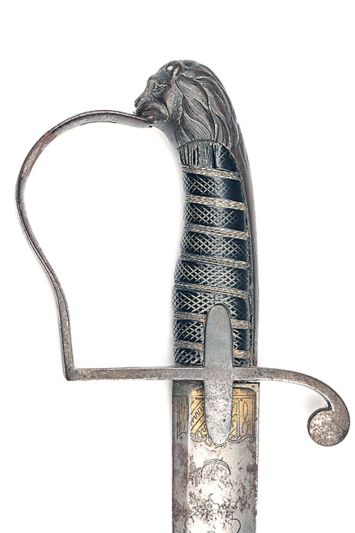 central European circa 1790, with curving broad fullered hatchet point 34 1/2in. blade (some discolouration and edge nicks), the fuller engraved with busts, scrolls and astrological symbols (traces of gilt wash at forte), iron hilt with straight cross-guard, single turned down quillion, 'P' shaped knucklebow, twin narrow langets, carved lionshead pommel and wire-bound chequered wood grip (some small losses to grip-piece), complete with its original iron bound scabbard, both sides with three flat oval windows showing the leather beneath, missing one of its original pair of suspension rings