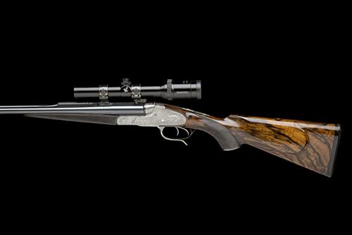 cat no. 7910, 25 3/4in. nitro barrels with acanthus scroll engraved sight rib, folding leaf sight with gold-inlaid sight line, acanthus scroll engraved ramp-mounted bead fore-sight, the breech end mounted with a Swarovski 1,25-4x24 Habicht telescopic sight, serial no. P760285425, in scroll engraved and gold-highlighted quickly-detachable mounts, with additional Schmidt & Bender 1 1/4-4x20 telescopic sight, serial no. 97290, in gold highlighted quickly-detachable mounts, Jaeger 1906 patent 'verticalblockverschluss' action with sprung breech face, carved fences, manual safety, gold-inlaid cocking-indicators, set front trigger, ejectors intermittently tripping upon fore-end removal, profusely engraved with fine acanthus scrollwork, the underlever gold-inlaid with the monogram 'MT', bright finish, 14 1/2in. highly-figured pistolgrip stock with cheekpiece, engraved steel pistolgrip-cap and including 1/2in. leather covered recoil pad, weight 8lb. 15oz. (unscoped), 10lb. 3oz. (with Swarovski scope) and 10lb. 4oz. (with Schmidt & Bender Scope)