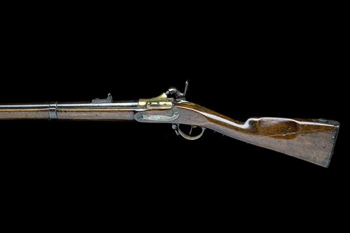 French circa 1854 and being a direct conversion of a Charville rifled musket to breech-loading, with 39in. barrel, blade fore-sight, elevating ladder rear-sight, swing-open brass breech-block and receiver with guide ramp running into the wrist, plain hump-back lock with side-hammer (sear at fault), walnut three-quarter stock, iron furniture and iron under-barrel ramrod