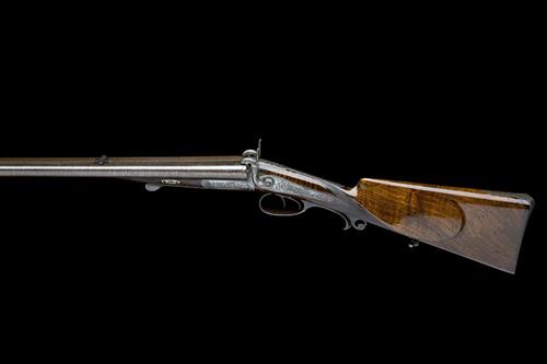 circa 1860, with fine twist re-browned 28 3/4in. barrels, the plain top-rib signed in silver 'C. FRANZ KELLER IN SUHL', dove-tailed blade fore-sight, folding leaf rear-sight, engraved band at breech, borderline and scroll engraved long top-tang, fully floral, border and gamescene engraved back-action locks, engraved dolphin hammers, chequered walnut butt-stock with raised cheek-piece, iron heel-plate, moulded horn lower tang cover, carved and engraved trigger-guard bow, single set trigger for the rifle-barrel, engraved rounded action, chequered walnut splinter fore-end and engraved Lefaucheux swing under-lever