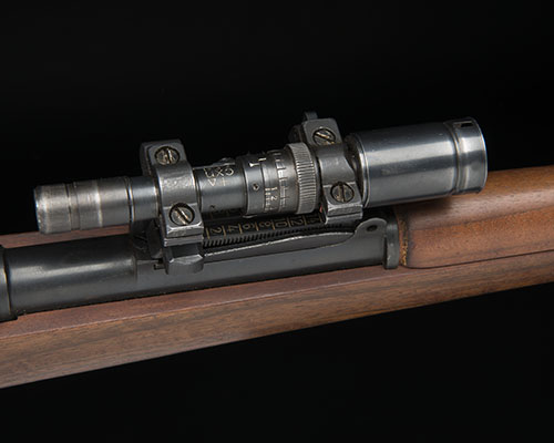 and dated for 1942, with blued 24 1/2in. barrel, dove-tailed blade fore-sight, elevating rear-sight, the left side of rear-sight with machined dove-tail, nocksform marked 'S42G', charger bridge and thumb cutout to the blued receiver, blued turned down bolt with rear flag safe, walnut three-quarter stock with machined furniture pieces except stamped trigger-guard and magazine floorplate, the whole with much finish and complete with a 'ZF41' telescopic 'sharp-shooter's' optical sight in its ordnance tan painted lozenge-shaped transit tin