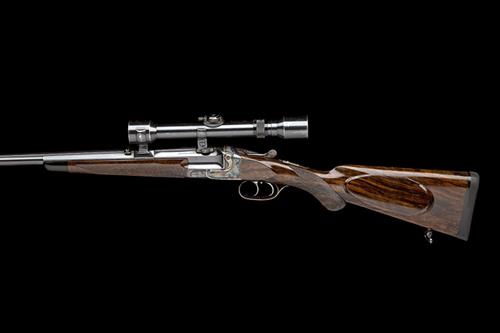 23 3/4in. Krupp-steel nitro octagonal to round nitro barrel with solid raised matt rib, open sights with folding leaf sight and ramped bead fore-sight, the breech end mounted with a Hensoldt Dialytan 4x telescopic sight, serial no. 17631, in quickly-detachable mounts, with second set of claw mounted 30mm rings, treble-grip action with short side bolsters, manual tang safety, set triggers, border engraving, retaining much renewed colour-hardening, 13 3/4in. figured semi-pistolgrip stock with cheekpiece, sling swivels and including 5/8in. rubber recoil pad, fore-end with Deeley & Edge patent release, weight 5lb. 15oz. (unscoped) and 6lb. 15oz. (with scope), in a canvas and leather case
