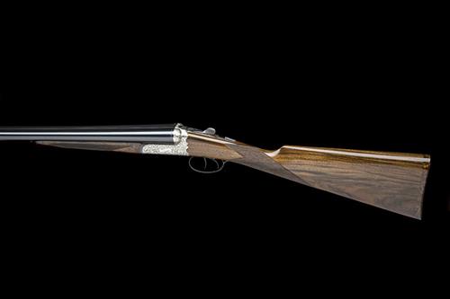 29in. nitro barrels, 3in. chambers, bored approx. 1/4 and 1/2 choke, Italian made scroll-back action, automatic safety, bold acanthus scroll engraving on a matted background, bright and blued finish, 15 3/4in. figured stock including wooden buttplate, weight 6lb. 4oz., in its case