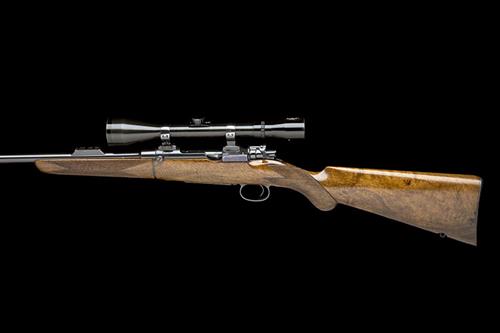 25in. nitro reproved barrel engraved 'DANIEL FRASER & CO. LTD. LONDON & EDINBURGH', block-mounted folding leaf sights with file cut finish, white metal inlaid sight lines and marked for 100, 200 and 300 yards, ramp-mounted bead fore-sight with provision for folding moonsight (not present), the receiver (with thumb cutout) mounted with a Pecar Champion 6x45 telescopic sight, serial no. A21283, in quickly-detachable mounts, intermediate action, receiver ring Mauser numbered 704 and with Waffenfabrik Oberndorf details under the mount base, coin slit barrel release screw, bolt with provision for rear mounted adjustable peepsight (present, not fitted), floorplate with military style release, blued finish overall, figured semi-pistolgrip stock with inset sling eye, 14 7/8in. pull including ribbed steel buttplate, weight 8lb. 11oz.