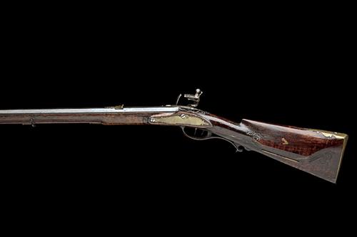 first quarter of the 18th century, probably German, with swamped octagonal 24 1/4in. barrel, blade fore-sight with inlet star background, carved brass standing notch rear-sight with additional folding leaf, engraved solid top-tang, bevel edged pointed step-tailed polished lock with etched and stippled panels (blacked in later), old working repairs to hammer, lozenge shaped pan, bridleless frizzen, carved frizzen-spring, carved and moulded fruitwood full-stock (old working repairs), wood patchbox, raised cheek-piece, carved apron around the top-tang, brass mounted carved wood trigger-guard, double set triggers, carved ramrod channel and probable replacement ramrod