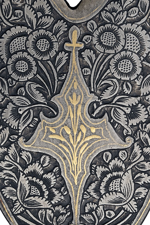 Indian, circa 1840, with 14in. blade separating after the first 3 3/4in. into two diverging flambeau blades, both with armour-piercing tips, the widest section near shaft chisel engraved with a gold koftgari bordered panel of flowers and foliage, the centre with a further gold koftgari arabesque panel repeated on the reverse, the shaft with opposing faceted facings each decorated in silver koftgari-work with a gold koftgari decorated blade-boss, 23in. overall