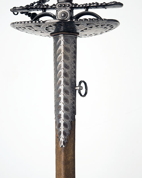 circa 1820, with concave triangular cross-section 30in. etched blade retaining its original polished finish, pierced steel oval guard with applied cut-steel decoration, broad cross-guard with small pas-de-ane and applied cut-steel decoration, fully decorated faceted steel grip-piece with en-suite urn pommel and twin cut-steel chain knuckle-bow, complete with its velum scabbard with iron mounts, the throat mount marked 'FIRMIN, SWORD CUTLER, 153 STRAND LONDON' below '35' (possibly a pattern number)