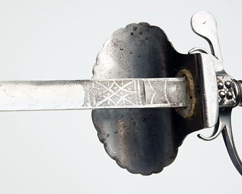 circa 1910, with concave triangular cross-section 31in. blade etched with scrolls and arabesques for much of its length, polished steel shell guard with narrow fluting and applied cut-steel decoration, small pas-de-ane with single turned down disk quillion and integral carved 'D' shaped knuckle-bow, polished steel grip-piece with applied cut-steel decoration in the form of binding and en-suite urn pommel, complete with its steel mounted black leather scabbard