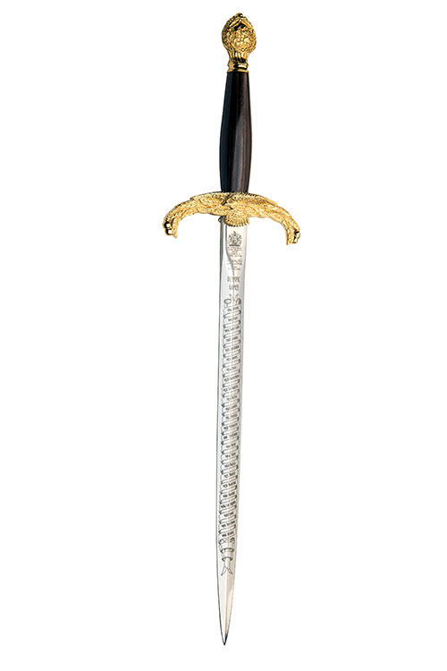 manufactured in 1996, with polished narrow 10 3/4in. blade etched with a flowing banner marked with the names and dates of every Olympic games from '1896' to '1996' and the manufacturer's trademark on one side, the reverse similar but with the names and dates of every Winter Olympics from '1924' to '1994', carved and moulded gilt cross-guard in the form of an eagle with spread drooping wings, the wing-tips terminating in laurel leaves and berries, smooth walnut grip swelling just below the centre, the end-piece with carved bishops mitre pommel, not supplied with a scabbard, complete with its red leatherette box with satin lined lid bearing the Wilkinson trademark, the tray lined in burgundy velvet, appearing unused