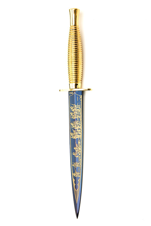 manufactured in 1982-83, with 7in. polished blued stiletto blade etched with a gilded image of British paratroopers within a gilt border, the reverse with standing paratrooper raising a Union Jack above a newspaper and scroll declaring 'VICTORY IN THE FALKLANDS' and the maker's trademark at the forte, gilded boat-shaped cross-guard, gilded ribbed metal hilt, not supplied with a scabbard, together with its red leatherette presentation box with Wilkinson's trademark to the satin of the lid lining along with the gilt wording 'THE FALKLANDS ONCE MORE UNDER THE GOVERNMENT DESIRED BY THEIR INHABITANTS - GOD SAVE THE QUEEN - MAJOR GENERAL JEREMY MOORE - JUNE 1982' the tray lined in burgundy velvet, as new