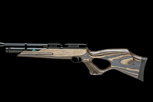 with blued 19 1/4in. barrel including detachable 'WEIHRAUCH' sound moderator, machined bolt-action receiver with detachable magazine and integral dove-tail for telescopic sight, rear-mounted safe, laminated wood ergonomic thumbhole half-stock with laser-cut stippled panels and adjustable comb, quick-fill adaptor and pressure-gauge to the front of air-chamber, complete with its maker's card carton and instructions