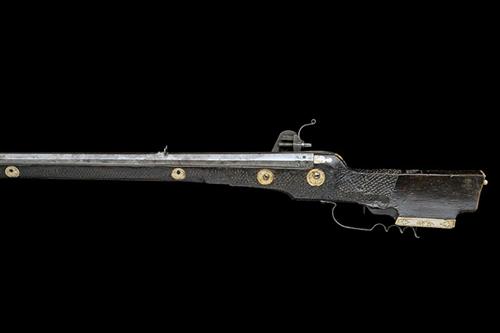 dated '1621' but probably late Georgian or early Victorian, with 35 1/2in. swamped octagonal sighted barrel, plain lock with external wheel (hammer spring fractured but present), walnut full stock (repairs throughout, patchbox-cover a probable replacement), stock with bone inlay and later ramrod.