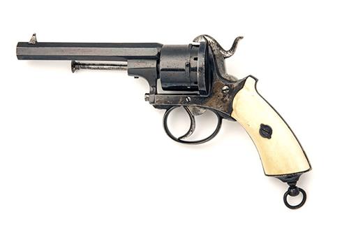 Belgian circa 1865, with blued octagonal 4 3/4in. barrel, dove-tailed fore-sight, rear-sight notch to the hammer-nose, blued open iron frame (losses to finish), plain six-shot blued cylinder with external ratchet locking, brushed bright hammer and guarded trigger, smooth semi saw-back ivory grips, faceted pommel with central lanyard ring, plunge ejector, the whole retaining much original finish