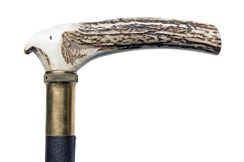 with 26in. barrel with detachable brass muzzle-cap, brass 'wedding-band' ring at join, twist and pull breech action, the loading tray signed 'J.WILSON MAKER, LONDON', gilt brass concealed trigger mechanism, natural staghorn handle with smooth thumb-rest, the body covered in black, grained leather.