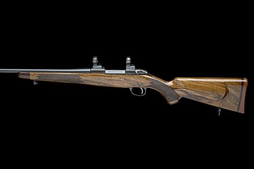 22 1/2in. unsighted nitro barrel threaded for a sound moderator, the receiver mounted with telescopic sight rings, detachable box magazine, well-figured pistolgrip stock with cheekpiece, sling swivels, 13 7/8in. pull including a 3/4in. rubber recoil pad, weight 7lb. 10oz.