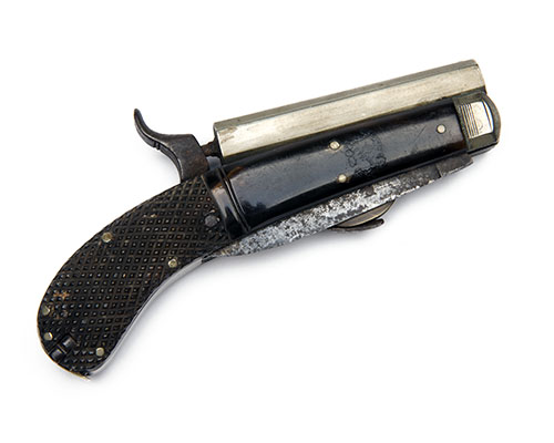 circa 1840, with nickel semi-octagonal 3 1/2in. barrel, Birmingham proofs, bead fore-sight, central hammer, half-chequered horn side-scales with nickel bolsters, rear hinged cap-box the underside with folding trigger, a double edged signed 3 1/4in. blade and a signed 2 1/2in. drop-point blade, storage in the rear of scales for a scissors mould and a pair of tweezers with loading rod combined