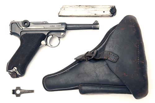 all dated for 1916, with 4in. barrel, dove-tailed fore-sight blade, standing notch rear-sight, the top of breech bearing date, the top of toggle with maker's monogram, blued receiver and frame, chequered walnut grips and period wood-based magazine, all matching numbers except magazine, much factory finish remaining and complete with its matching date service holster, the inside of flap marked 'B.94.MG' and maker marked 'A. DAHL, ARMEN', spare magazine (miss-matched number) and loading tool