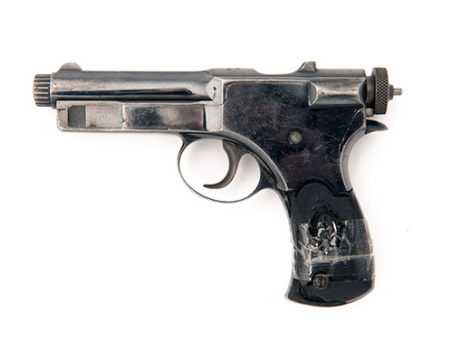 circa 1906, with unique 'long-recoil' 4in. sliding barrel and bolt, blued barrel shroud and receiver, the top-flat signed 'J.P. SAUER & SOHN, SUHL, the receiver bridge marked 'PATENT ROTH' and 'Sauer' trademark behind charger bridge, removable side-plate to frame stamped with a crown over the letter 'R', internal magazine, chequered hard-rubber grips with 'Sauer' trademark (chipped and cracked), the back-strap stamped 'L.P.7', the whole retaining much original mirror-blued finish and colour-hardened ancillaries together with a rare stripper clip for same