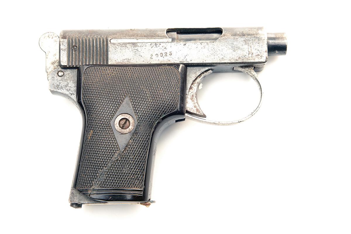 ** A 6.35mm (.25ACP) SEMI-AUTOMATIC POCKET-PISTOL SIGNED WEBLEY & SCOTT, MODEL '1907 HAMMER', serial no. 54349, with blued 2in. barrel, blued slide with additional South African registration number 'Z9023' stamped on the right hand side, blued frame, chequered hard rubber grips (cracked and repaired with small losses), and nickel-plated trigger-guard