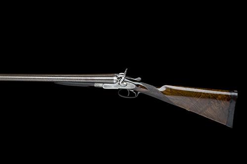 30in. black powder only bold damascus barrels, rib engraved 'BOSS & CO. 73 ST. JAMES'S STREET. LONDON.', 2 1/2in. chambers, bored approx. true cyl. in both, internally pitted and left wall at 18+, action incorporating John Thomas patent 3091 of 15th November 1871, carved percussion fences, offset toplever, rebounding sidelocks with dolphin hammers, signed Boss & Co., fine acanthus scroll engraving, brushed finish overall, 15in. highly-figured stock including 7/8in. leather covered recoil pad, fore-end with E. Hollis patent release lever, patent no. 953 of 1873, weight 7lb. 2oz.