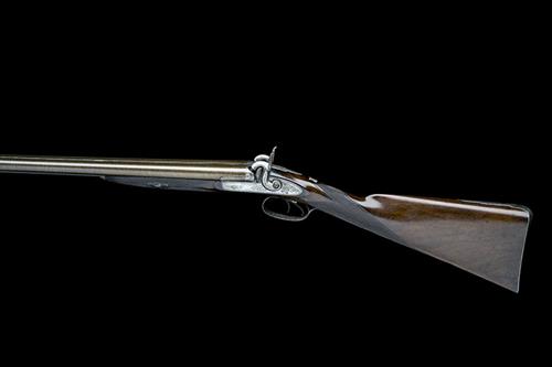 A 12-BORE PERCUSSION DOUBLE-BARRELLED SPORTING-GUN SIGNED 'ROSSON', no visible serial number,